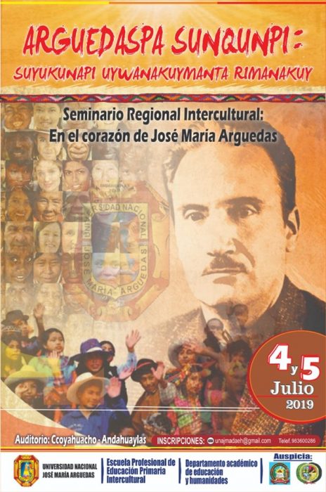 La Escuela Profesional de Educación Primaria Intercultural y el Departamento de Académico de Humanidades de la Universidad Nacional José María Arguedas de Andahuaylas, Apurímac (UNAJMA) organiza el I Seminario Regional Intercultural los días 4 y 5 de julio. Evento tiene como finalidad dialogar sobre la práctica y el significado de la interculturalidad en la sociedad, la educación y la política.