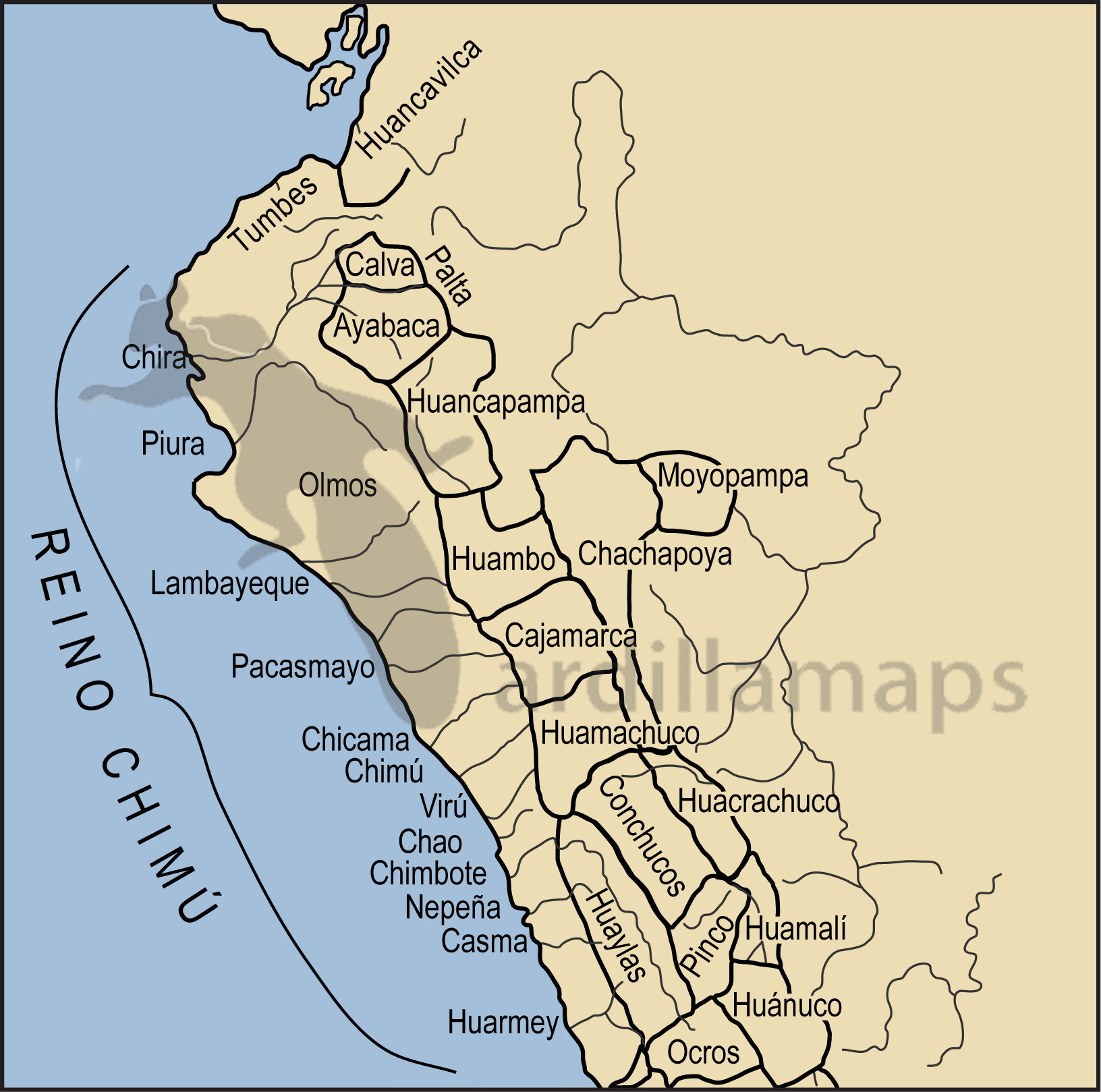 Sección del mapa “Tribus y provincias del imperio inca hacia 1530. Parte Central” de John H. Rowe, correspondiente a los Andes norperuanos (redibujado por la geógrafa Martha Bell). Fue originalmente elaborado usando información documental colonial (principalmente a Pedro Cieza de León, para la región tratada). Pese a sus limitaciones, reconocidas por el propio autor, y a las críticas que ha recibido, es una herramienta básica para toda discusión sobre la distribución de los grupos étnicos durante el Horizonte Tardío.