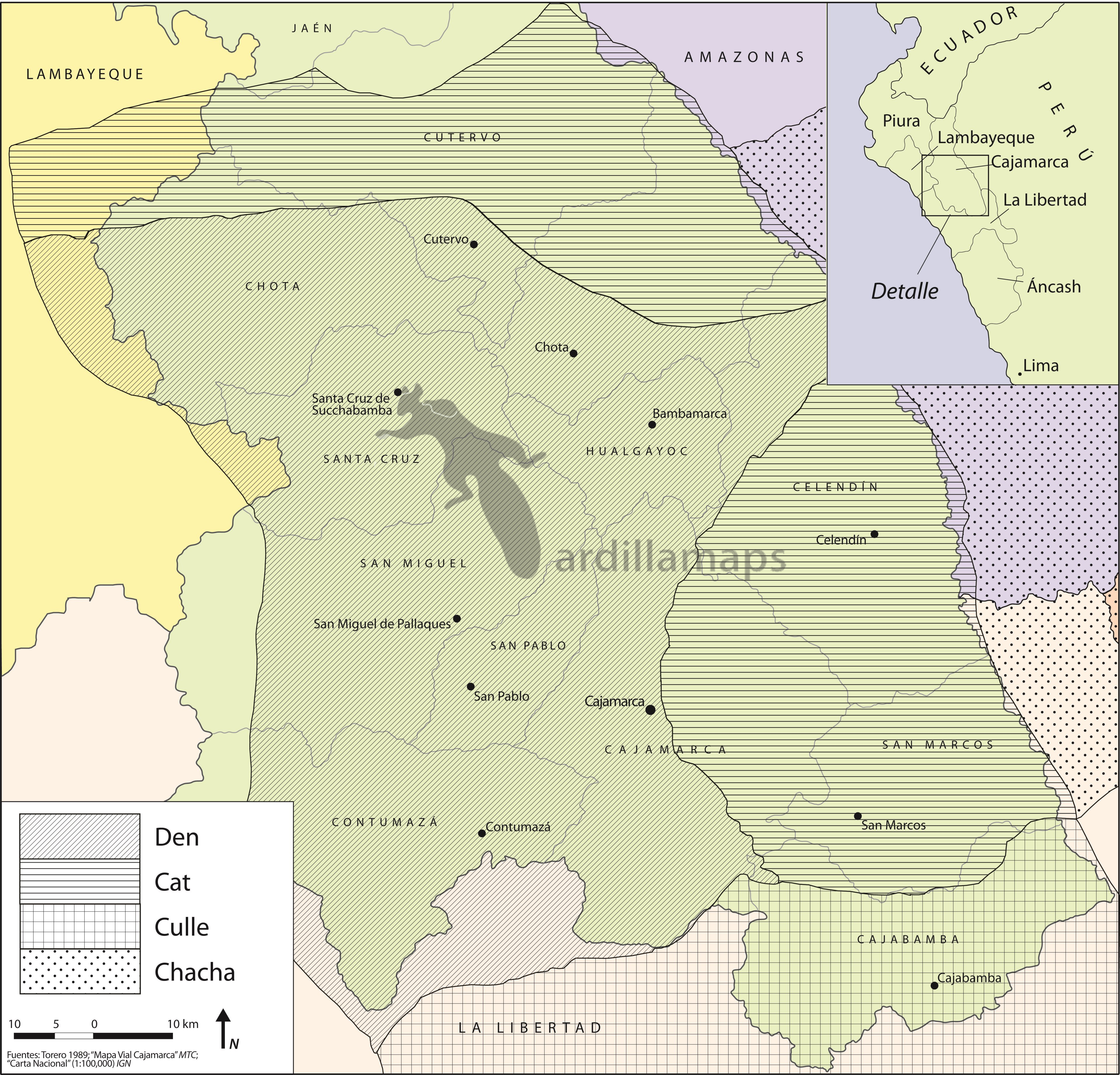 Este mapa, redibujado por la geógrafa Martha Bell a partir del que propuso el lingüista Alfredo Torero, representa la distribución geográfica de las lenguas indígenas nativas de los Andes norteños. El mapa se basa principalmente en el análisis de la toponimia o de los nombres de lugares y, en el caso de la zona culle y chacha, también en fuentes documentales. Torero llamó al culle, den, cat y chacha “lenguas prequechuas de la sierra norte peruana”.