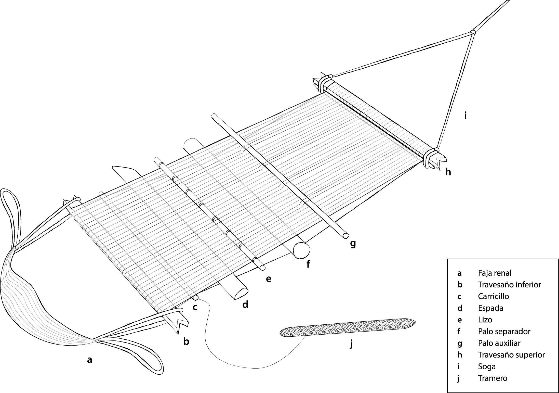 Figura 1. El telar de cintura del sur de Cajamarca y su instrumental. Modelo de Jangalá (San Miguel de Pallaques).