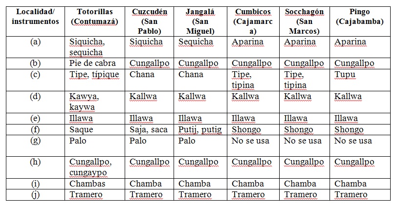 cuadroComo vemos en el cuadro, hay algunos nombres indígenas que se repiten a lo largo del sur de Cajamarca, con ligeras variantes (items d, e, h e i). Crucialmente, estos son indigenismos; solamente un nombre generalizado en toda la zona deriva del castellano (ítem j). Esto muestra la estabilidad de los indigenismos en la nomenclatura del telar. También observamos variabilidad entre los nombres indígenas que se aplican a un mismo instrumento. Por ejemplo, en los items a, c y f, observamos diferentes opciones derivadas de lenguas indígenas según la zona. En el caso a, tenemos dos distintas alternativas quechuas; en los casos c y f, además de opciones quechuas («tipe-tipina», «tupu» y «shongo»), observamos indigenismos no quechuas, derivados de las lenguas indígenas cajamarquinas previas a la difusión de este idioma («chana», «saque-saj-saca» y «putij»), los que se suman a los indigenismos «chambas-chamba» y «cungallpo», que tampoco tienen un origen quechua transparente. Esto último muestra que no solo hay estabilidad de los indigenismos sino también variabilidad entre ellos, lo cual es llamativo si consideramos la uniformidad del telar de cintura a lo largo de las seis provincias visitadas, tanto en términos del instrumental utilizado como en cuanto a la secuencia productiva empleada para obtener un tejido llano.