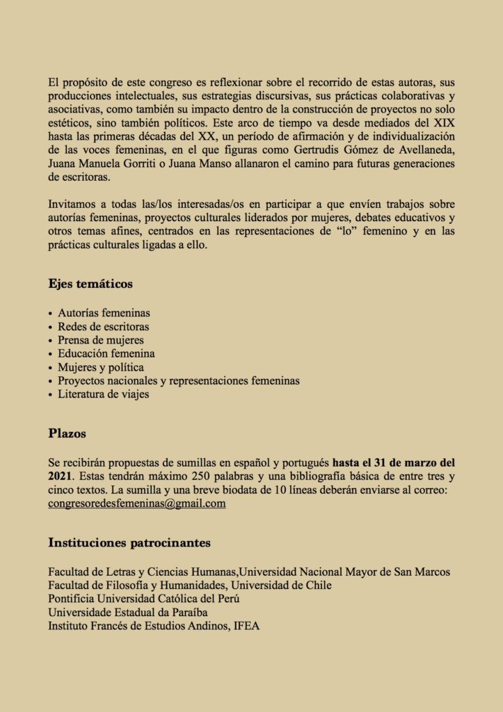 Les invitamos a participar en la convocatoria al I Congreso Internacional Proyectos estético-políticos y redes intelectuales femeninas de entresiglos en América Latina que se realizará el 22, 23 y 24 de junio del 2021 en forma virtual.