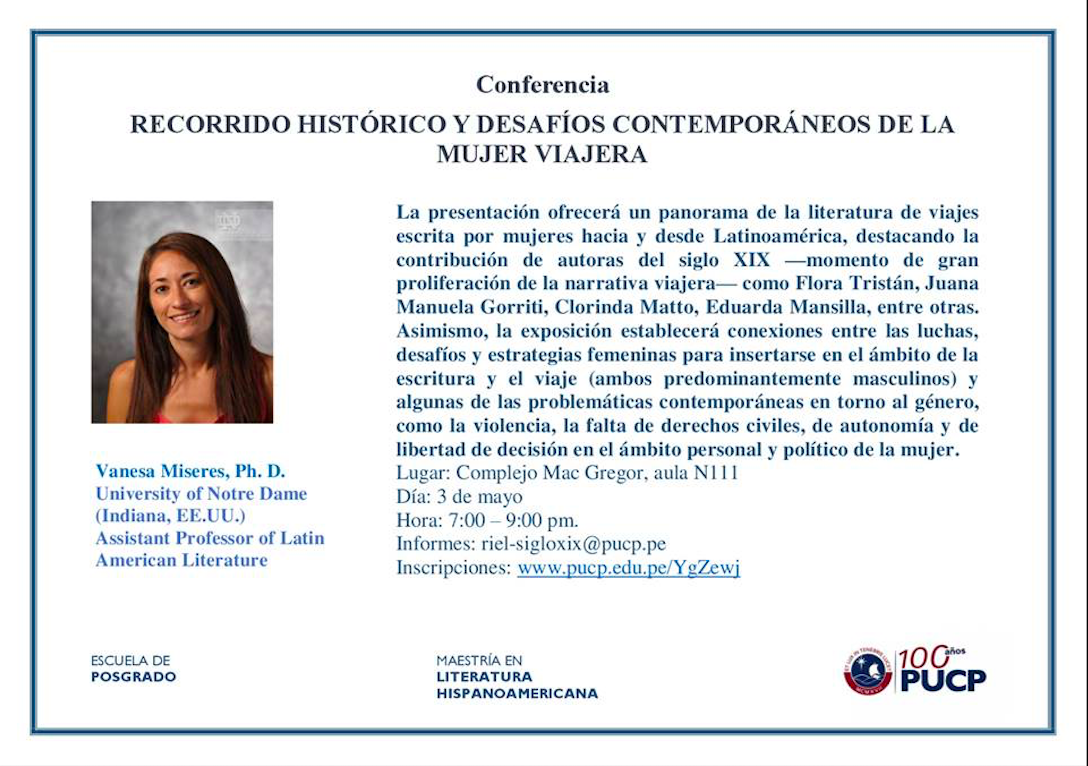 La presentación ofrecerá un panorama de la literatura de viajes escrita por mujeres hacia y desde Latinoamérica, destacando la contribución de autoras del siglo XIX —momento de gran proliferación de la narrativa viajera— como Flora Tristán, Juana Manuela Gorriti, Clorinda Matto, Eduarda Mansilla, entre otras. Asimismo, la exposición establecerá conexiones entre las luchas, desafíos y estrategias femeninas para insertarse en el ámbito de la escritura y el viaje (ambos predominantemente masculinos) y algunas de las problemáticas contemporáneas en torno al género, como la violencia, la falta de derechos civiles, de autonomía y de libertad de decisión en el ámbito personal y político de la mujer.
