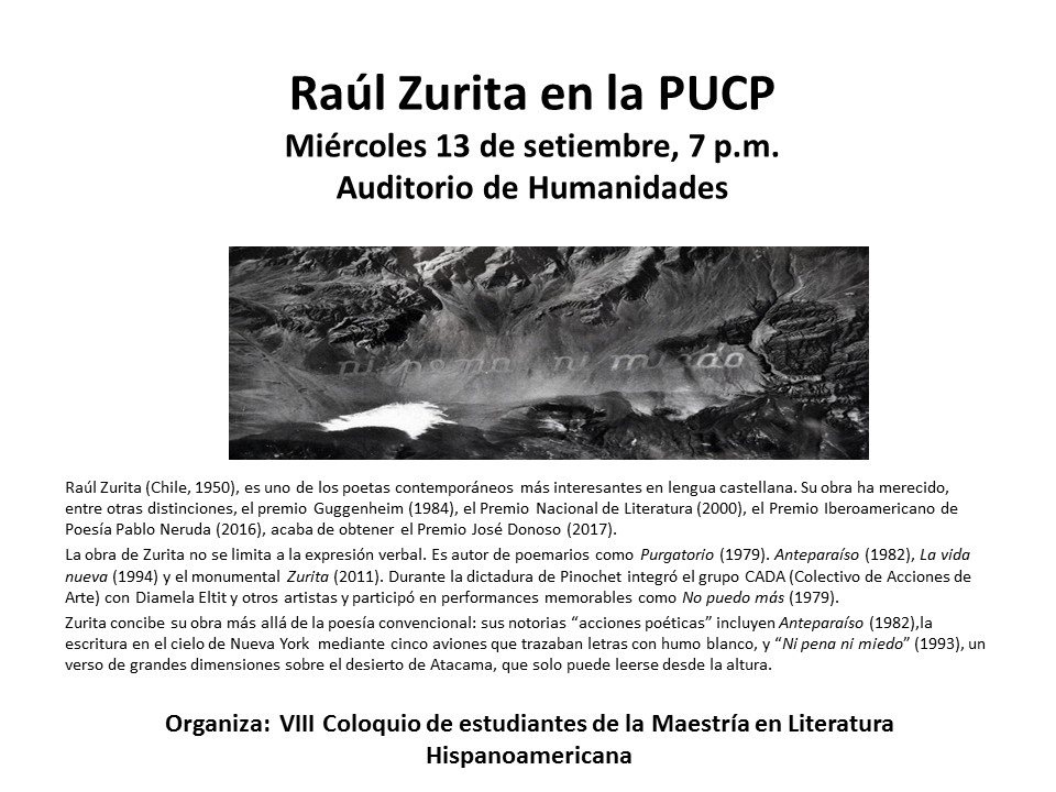 El Comité organizador del VIII Coloquio de Estudiantes de la Maestría en Literatura Hispanoamericana los invita al Conversatorio-recital del poeta Raúl Zurita en la PUCP