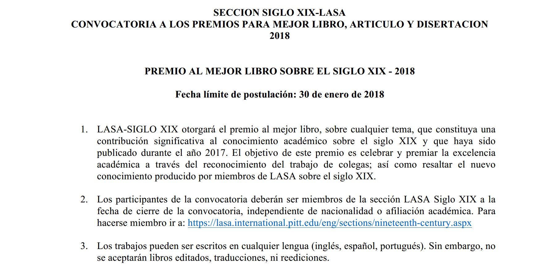 - LASA-SIGLO XIX otorgará el premio al mejor artículo, sobre cualquier tema, que constituya una contribución significativa al conocimiento académico sobre el siglo XIX y que haya sido publicado durante el año 2017. El objetivo de este premio es celebrar y premiar la excelencia académica a través del reconocimiento del trabajo de colegas; así como resaltar el nuevo conocimiento producido por miembros de LASA sobre el siglo XIX.