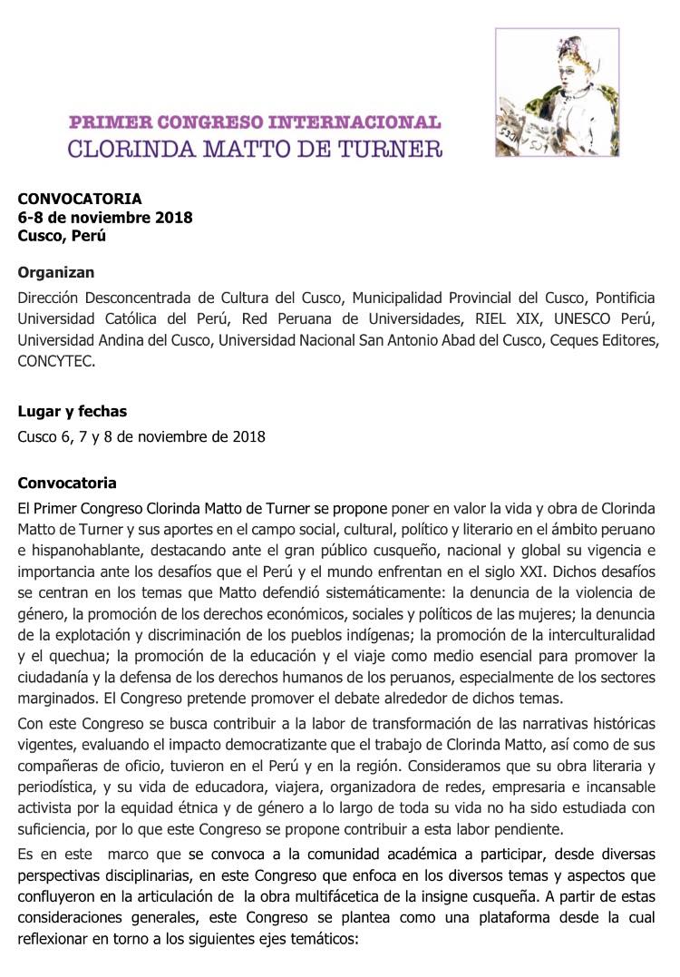 El Primer Congreso Clorinda Matto de Turner se propone poner en valor la vida y obra de Clorinda Matto de Turner y sus aportes en el campo social, cultural, político y literario en el ámbito peruano e hispanohablante, destacando ante el gran público cusqueño, nacional y global su vigencia e importancia ante los desafíos que el Perú y el mundo enfrentan en el siglo XXI. Dichos desafíos se centran en los temas que Matto defendió sistemáticamente: la denuncia de la violencia de género, la promoción de los derechos económicos, sociales y políticos de las mujeres; la denuncia de la explotación y discriminación de los pueblos indígenas; la promoción de la interculturalidad y el quechua; la promoción de la educación y el viaje como medio esencial para promover la ciudadanía y la defensa de los derechos humanos de los peruanos, especialmente de los sectores marginados. El Congreso pretende promover el debate alrededor de dichos temas.
