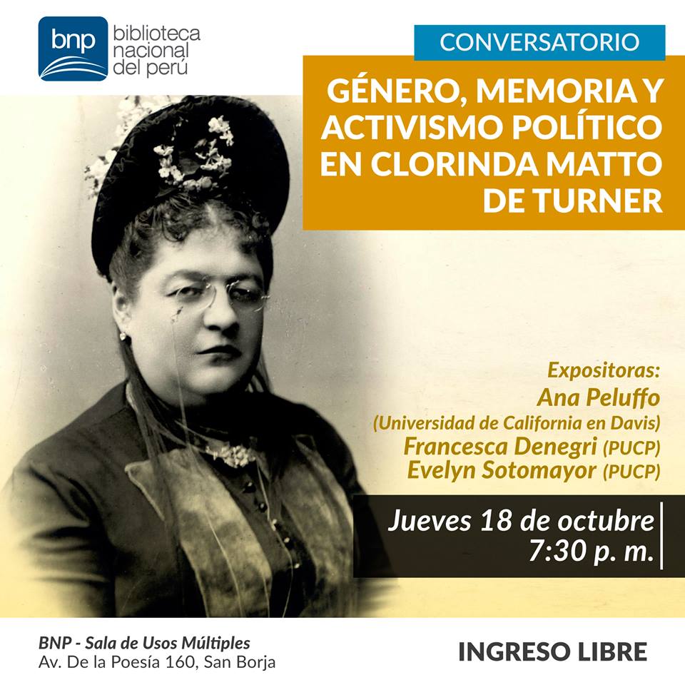 Partiendo de procesos históricos, políticos y sociales de la segunda mitad del siglo XIX peruano, esta mesa busca analizar y discutir la participación de Clorinda Matto por contribuir en la ampliación del espacio público para las mujeres. A través del empleo de categorías como memoria, género y activismo político se buscará situar a Clorinda Matto como una gestora cultural y activista de la etapa de la posguerra. La mesa discute la idea generalizada de que la mujer decimonónica no participaba en política. Matto desde diferentes espacios como el periodismo, la gestión cultural y la escritura de narrativa abogó por la inclusión del andino en el proyecto nacional, especuló sobre la importancia del uso del quechua, así como la secularización de la educación femenina. A puertas del bicentenario y de la emergencia de #MeToo y Ni una menos urge repensar temas irresueltos de la agenda nacional y proponemos realizar ello a la luz de los planteamientos mattianos.