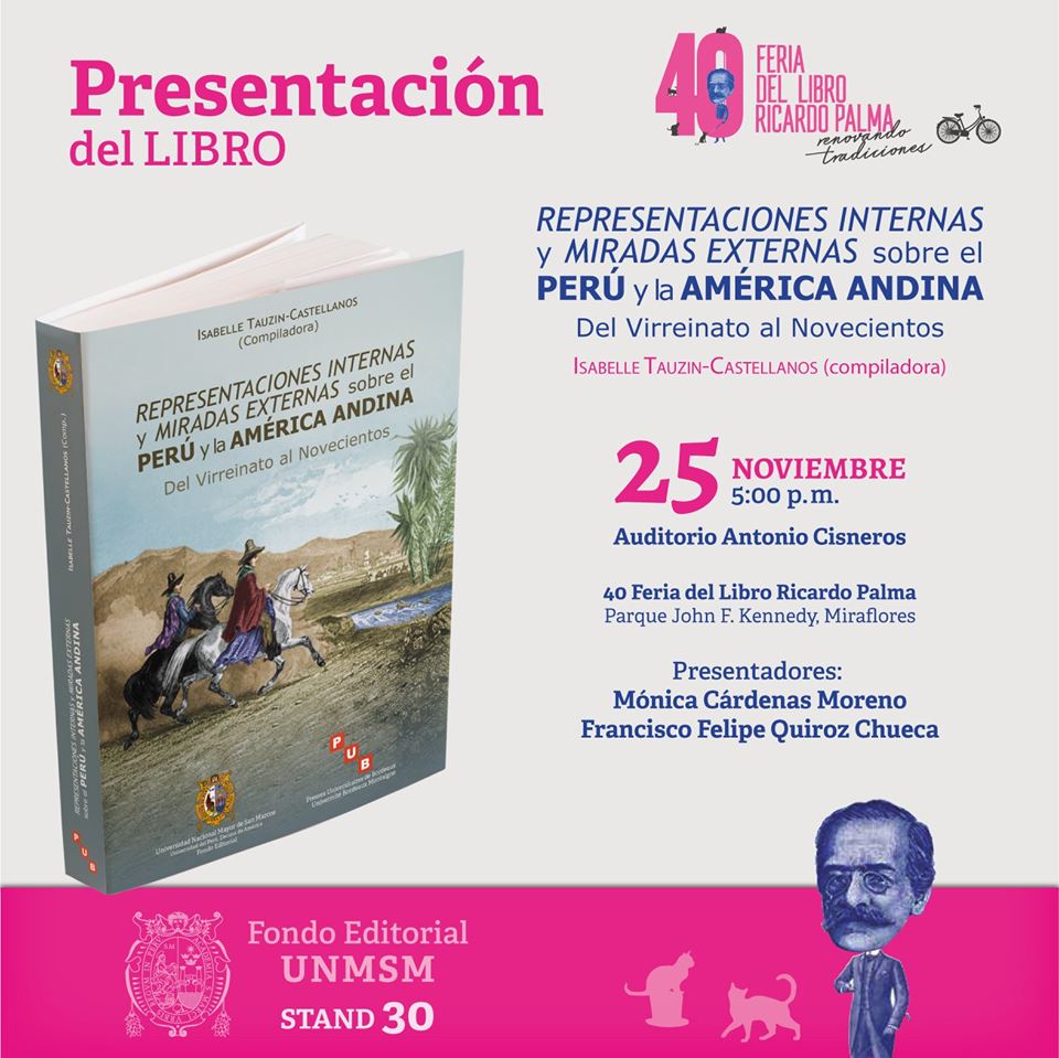 «Este libro constituye una revisión pluridisciplinar de dos siglos de historia cultural y social de la América andina, con especial interés en el caso del Perú. La publicación reúne los estudios de diversos especialistas, quienes han colaborado proponiendo sugerentes temas, como una corografía de la ciudad de Arequipa realizada por el presbítero Ventura Trabada y Córdoba; la incorporación de la Amazonía en la literatura por el autodenominado «Cantor de América», José Santos Chocano; la visión del mundo en la América virreinal; el militarismo realista en el Perú; la gobernanza republicana en Chile y Ecuador; la singular representación del oriente boliviano; los aportes de la prensa limeña sobre poblaciones «subalternas»; la formación de colecciones documentales por algunos americanistas con intuiciones interculturales; las imágenes iconográficas y textuales del Perú; y la confrontación de alteridades a partir de miradas exógenas como la de Voltaire, autor de una tragedia seudoincaica, o la del militar hispanofrancés José de Canterac.» (tomado de https://www.facebook.com/events/477060352907090/)