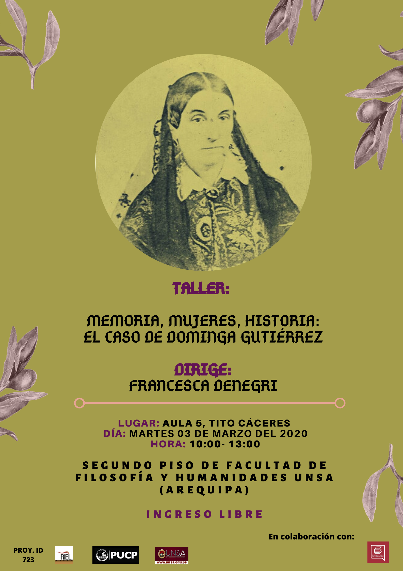 El 03 de marzo del presente año, Francesca Denegri ofrecerá un taller acerca de la construcción de la memoria, el devenir vital de Dominga Gutiérrez y los entrelazamientos con la historia en la Universidad Nacional de San Agustín de Arequipa.