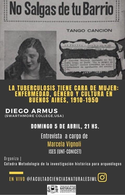 Bajo el anΓ‘lisis de canciones y en un contexto donde la enfermedad ha trascendido toda frontera y rostro para obligarnos a refugiarnos entre las paredes, Diego ArmusΒ (Swarthmore College, USA) serΓ‘ entrevistado por Marcela Vignoli (ISES UNT- CONICET) para conversar sobre la enfermedad de las heroΓnas romΓ‘nticas: la tuberculosis.Β