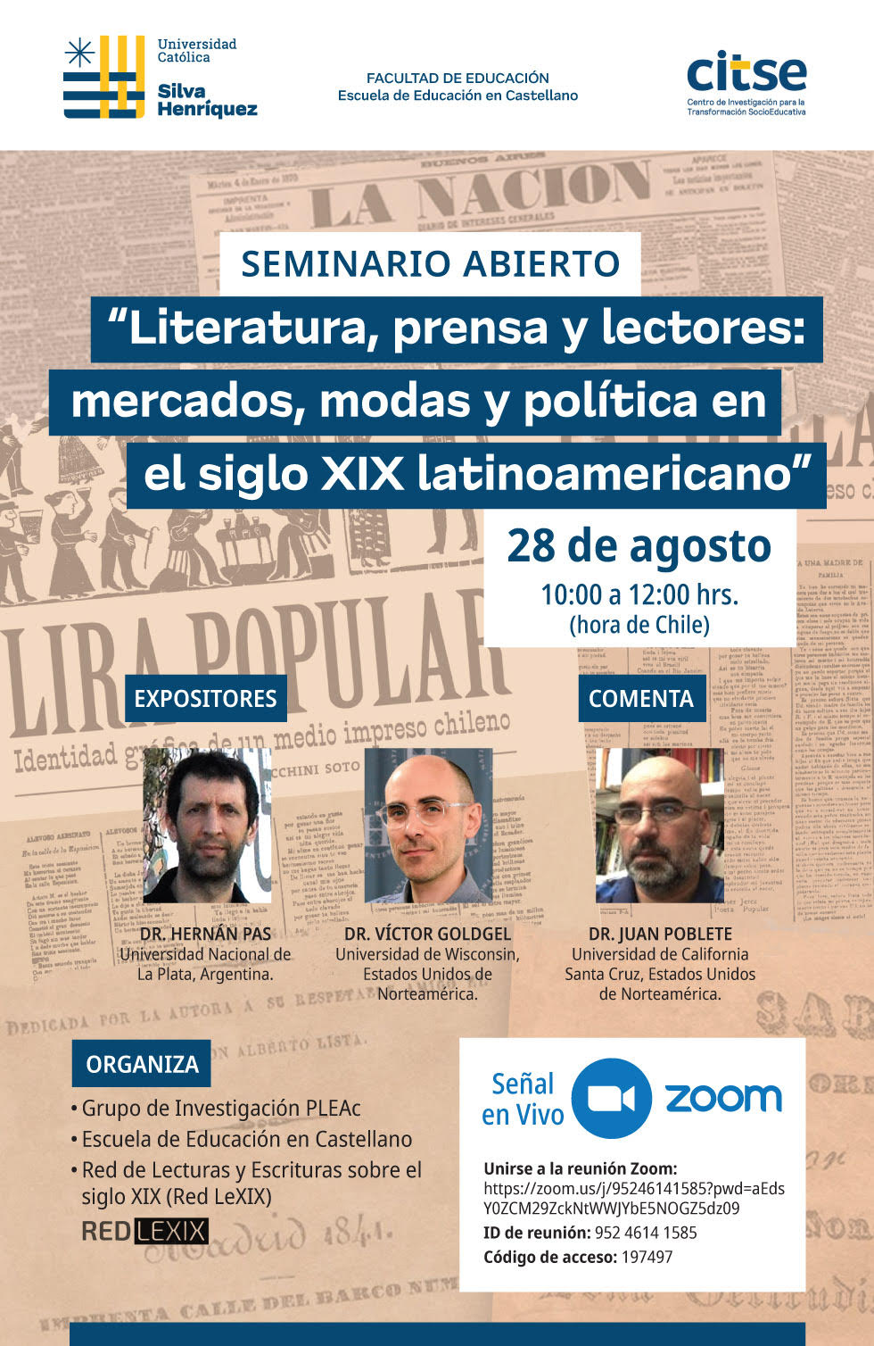 Compartimos la invitación de la Red LEXIX al webinar sobre “Literatura, prensa y lectores: mercados, modas y política en el siglo XIX latinoamericano”. Ingresa al siguiente enlace: