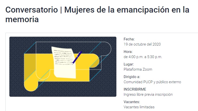 Compartimos de la Dirección de Gestión de la Investigación – DGI y del Departamento de Humanidades PUCP información sobre el conversatorio “Mujeres de la emancipación en la memoria” que tendrá como expositoras a Francesca Denegri (PUCP), Patricia Martínez (Universidad de Barcelona) y Natalia Sobrevilla (Universidad de Kent), y como moderadora a Claudia Rosas (PUCP).
