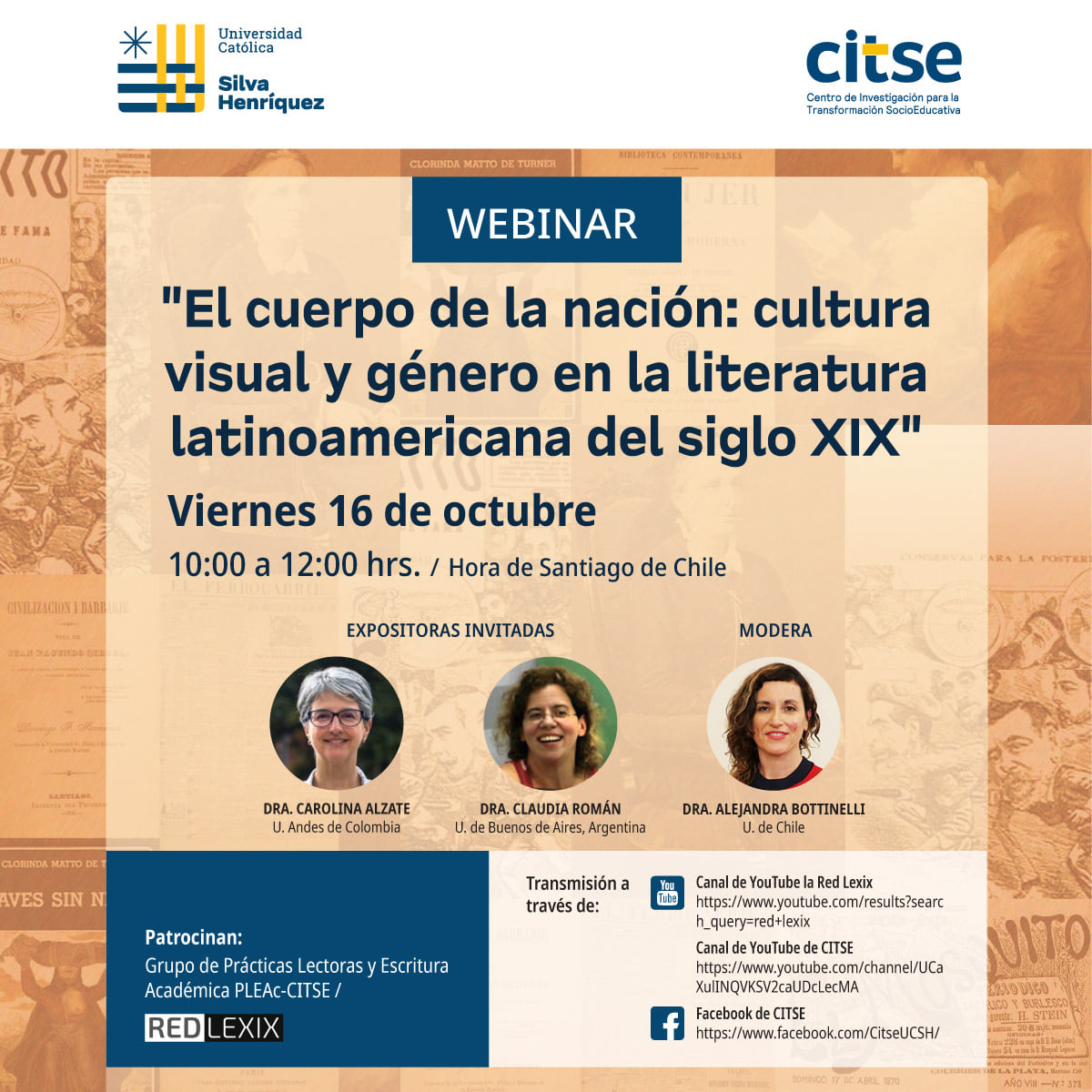 Compartimos de CITSE UCSH el conversatorio “El cuerpo de la nación: cultura visual y género en la literatura latinoamericana del siglo XIX”, realizado por el grupo de Prácticas Lectoras y Escritura Académica (PLEAc), Centro de Investigación para la Transformación SocioEducativa (CITSE) en alianza con la Red LEXIX. Las exposiciones estarán a cargo de Carolina Alzate y Claudia Román, y los comentarios por Alejandra Bottinelli.
