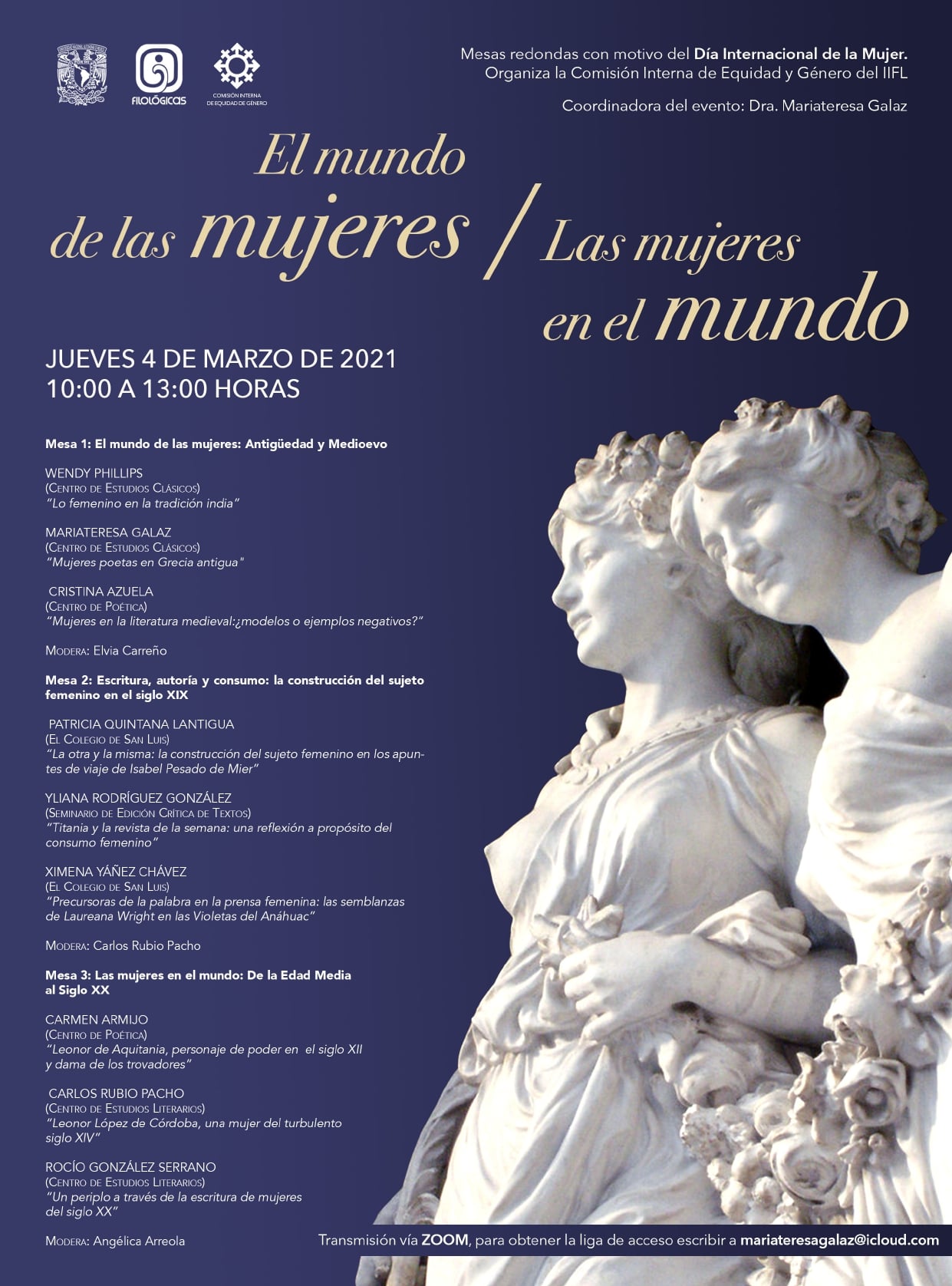 Compartimos las mesas redondas que organiza la Comisión Interna de Equidad y Género del IIFL: El mundo de las mujeres / Las mujeres en el mundo. El ingreso es libre, previa inscripción. Para participar, escribe al correo siguiente: mariateresagalaz@icloud.com