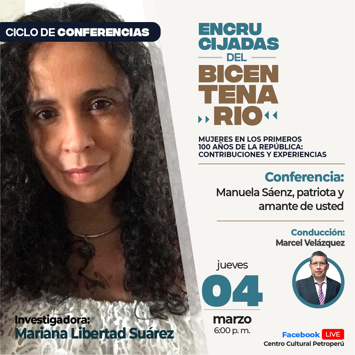 Del Centro Cultural Petroperú, compartimos la información sobre la primera conferencia que se realizará en “Encrucijadas del Bicentenario: Mujeres en los primeros 100 años de la República: contribuciones y experiencias”. Se titula “Manuela Sáenz, patriota y amante de usted” y la conferencista es Mariana Libertad Suárez. La conducción estará a cargo de Marcel Velázquez.