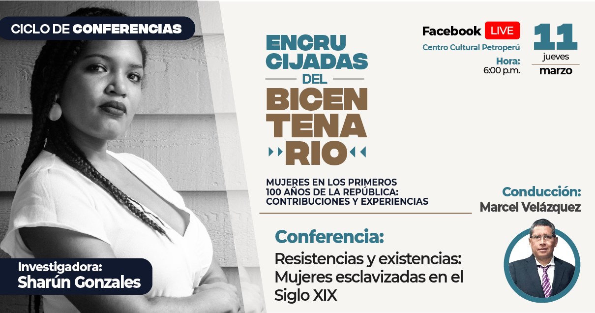 Del Centro Cultural Petroperú, compartimos la información sobre la segunda conferencia que se realizará en “Encrucijadas del Bicentenario: Mujeres en los primeros 100 años de la República: contribuciones y experiencias”. Se titula “Resistencias y existencias: Mujeres esclavizadas en el Siglo XIX” y la conferencista es Sharún Gonzales. La conducción estará a cargo de Marcel Velázquez.