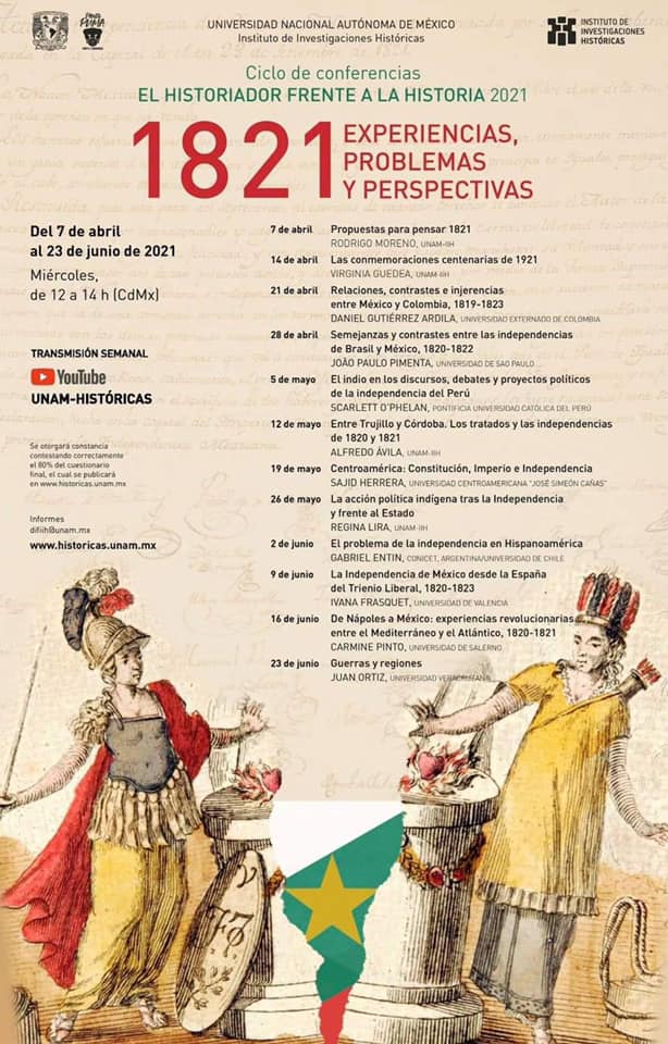 Del Instituto de Investigaciones de la Universidad nacional Autónoma de México, compartimos información sobre el ciclo de conferencias “El historiador frente a la Historia 1821. Experiencias, problemas y perspectivas”. El evento se realizará del 7 de abril al 23 de junio.