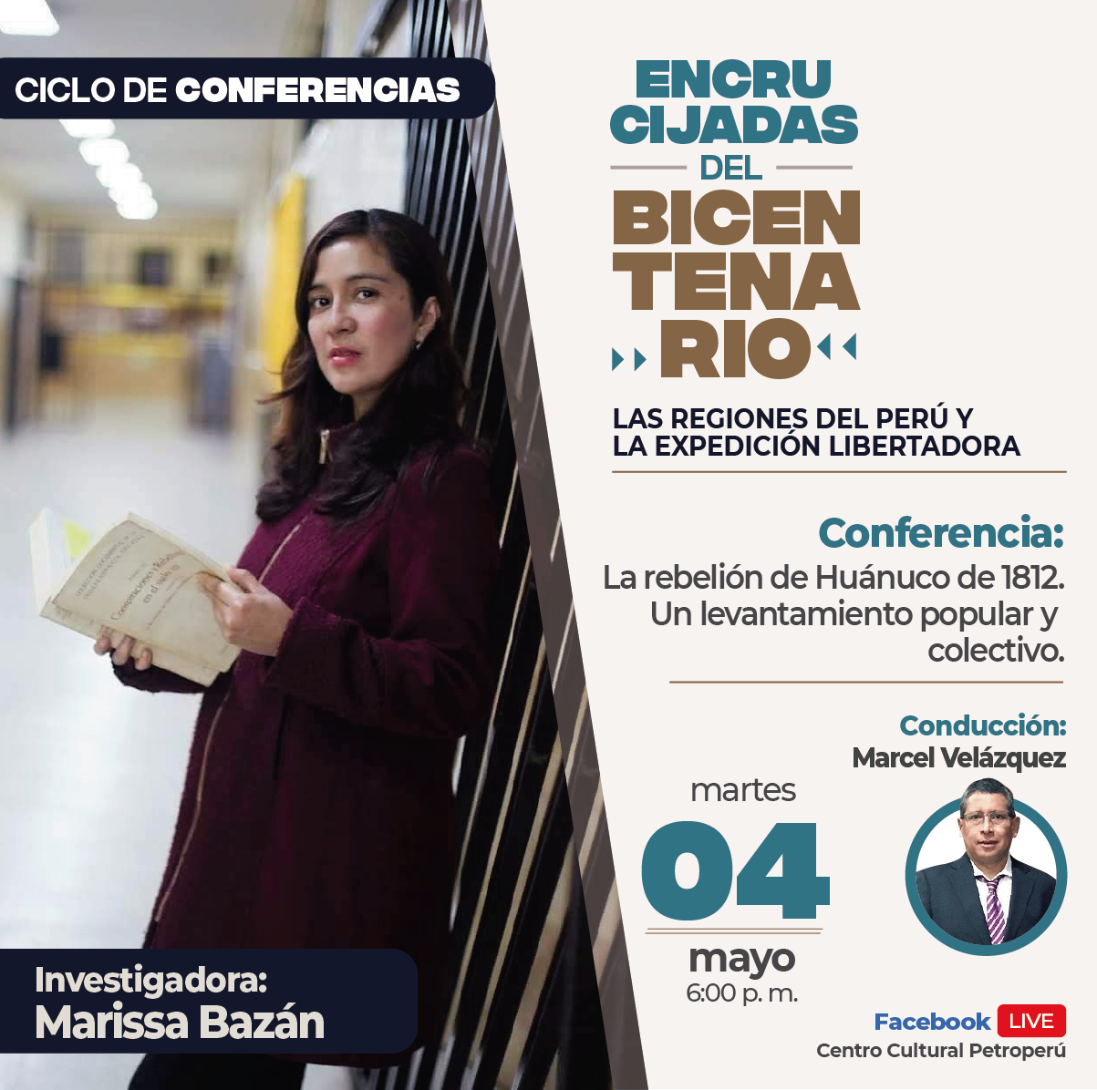 El Centro Cultural Petroperú inicia la cuarta edición del ciclo de conferencias “Encrucijadas del Bicentenario: Las regiones del Perú y la Expedición Libertadora”. La primera conferencia será “La rebelión de Huánuco de 1812. Un levantamiento popular y colectivo”, a cargo de Marissa Bazán Díaz, historiadora de la Universidad de San Marcos y Máster de Historia por la Universidad Jaume I de Castellón de la Plana-España.