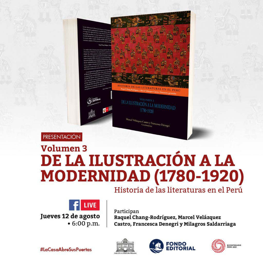 Compartimos información sobre la presentación del Volumen 3 de Historia de las literaturas en el Perú: “De la Ilustración a la modernidad (1780-1920)” co-editado por Francesca Denegri y Marcel Velázquez. El volumen cuenta con 13 artículos, decenas de imágenes y una renovada visión de la literatura en el Perú durante el largo siglo XIX (1780-1920) de destacados especialistas.