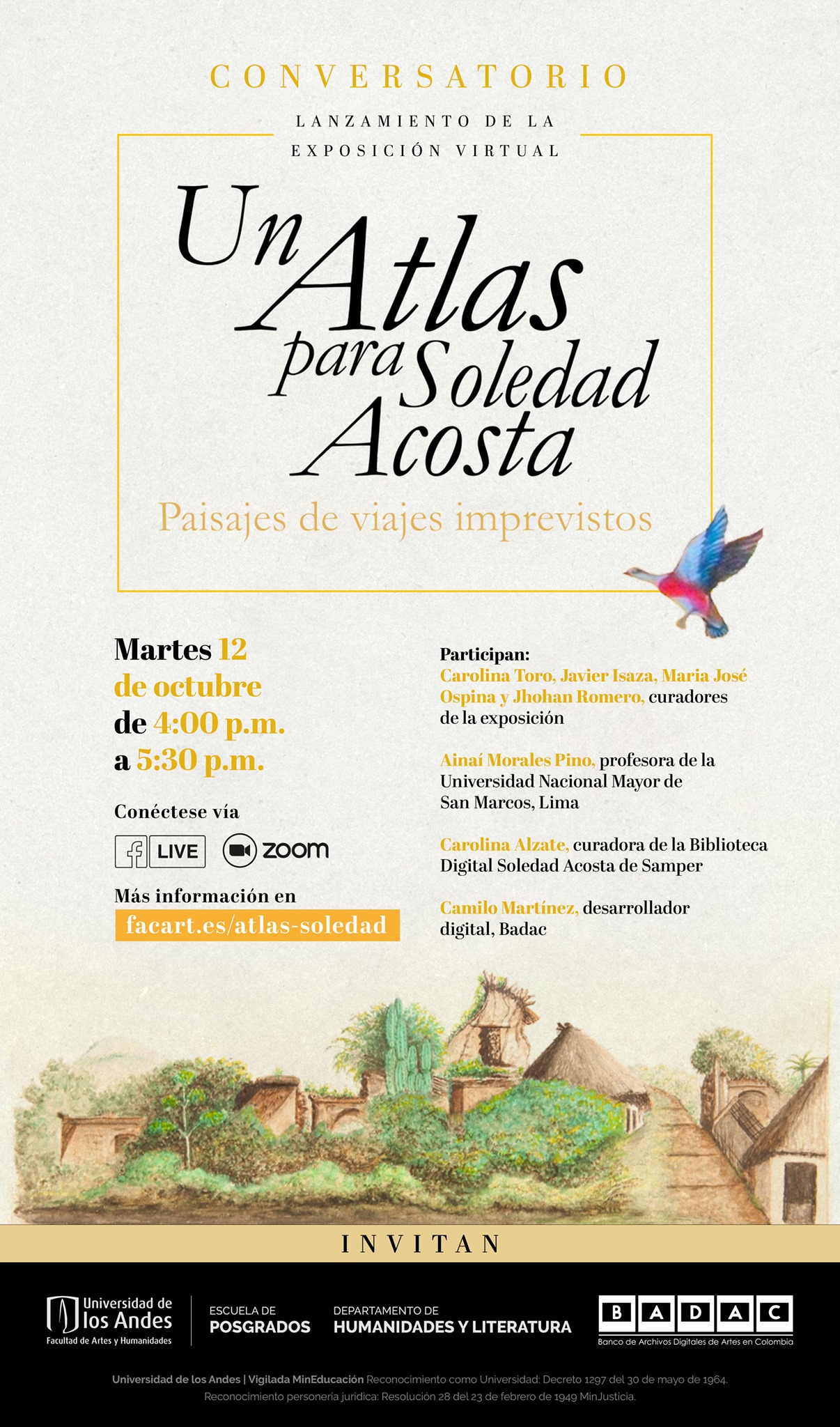 Compartimos la invitación de Humanidades y Literatura de la Universidad de los Andes al lanzamiento de la exposición Un Atlas para Soledad Acosta. Paisajes de viajes imprevistos.