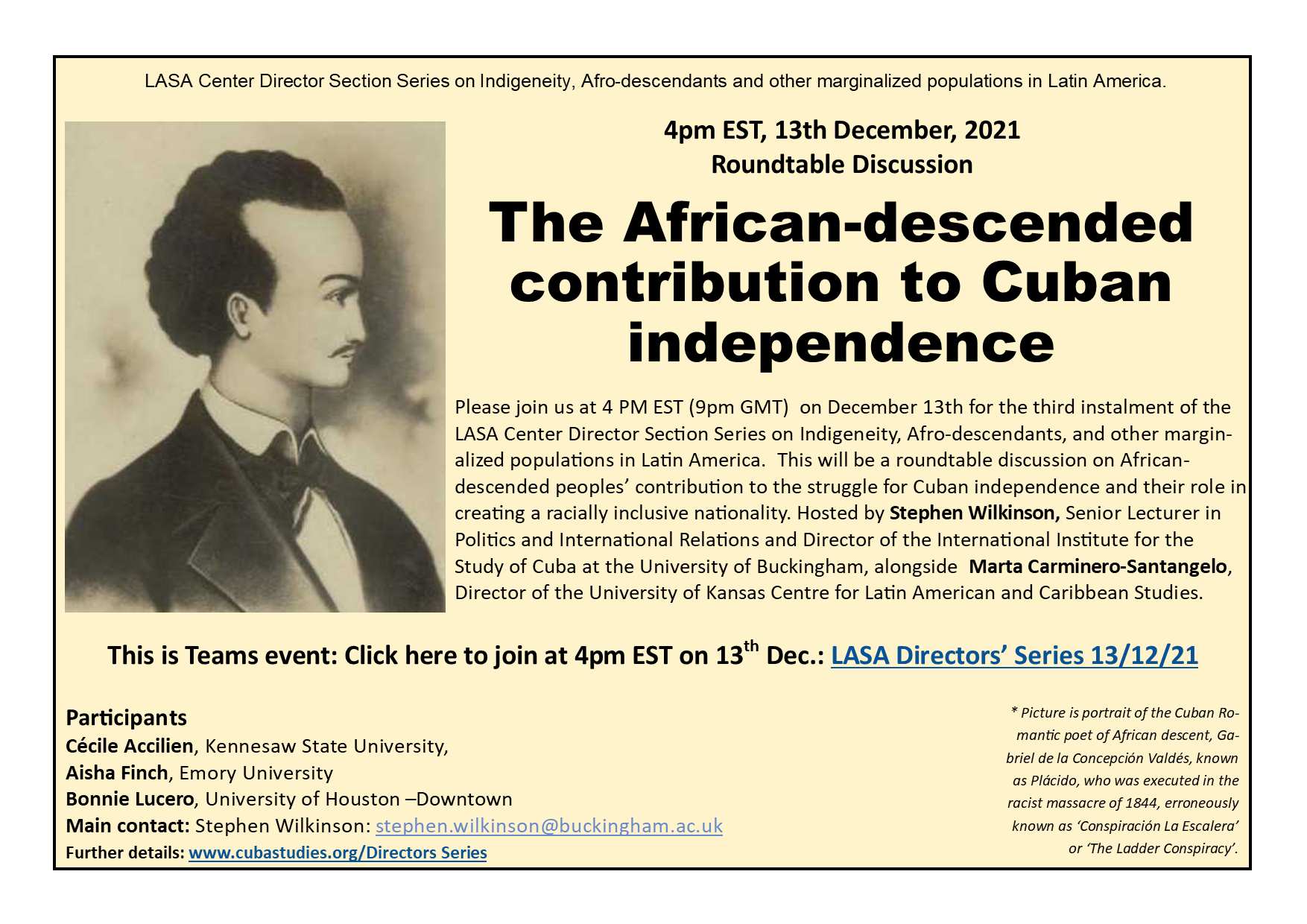 Compartimos de Latin American Studies Association la invitación a la tercera entrega de su serie sobre poblaciones que fueron marginadas en América Latina. Se discutirá sobre la contribución de los pueblos de ascendencia africana a la lucha por la independencia cubana y su papel en la creación de una nacionalidad racialmente inclusiva. Será presentado por Stephen Wilkinson y Marta Carminero-Santangelo.