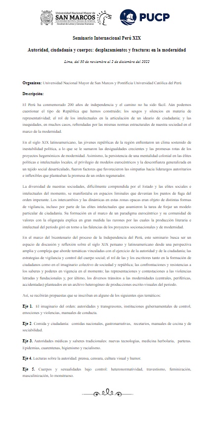 Compartimos la convocatoria para el “Seminario Internacional Perú XIX. Autoridad, ciudadanía y cuerpos: desplazamientos y fracturas en la modernidad”, que se realizará del 30 de noviembre al 2 de diciembre del 2022.