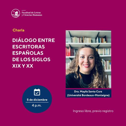 Invitamos a la comunidad académica a la charla internacional «Diálogo entre escritoras españolas de los siglos XIX y XX», que estará a cargo de la Dra. Maylis Santa Curz (Université Bordeaux-Montaigne). El ingreso es libre, previo registro.