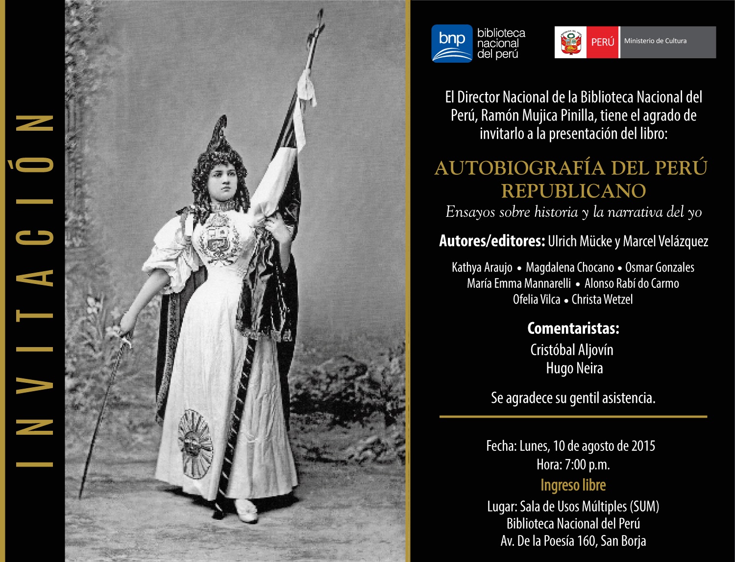 La Biblioteca Nacional del Perú (BNP) presentará el próximo lunes 10 de agosto a las 19:00 hrs., el libro: Autobiografía del Perú Republicano: Ensayos sobre historia y la narrativa del yo cuyo contenido enfocado en los siglos XIX y XX permite explorar la idea moderna que tiene el peruano de si mismo en esta etapa republicana y en una sociedad cada vez más secularizada, es decir que abandona los principios y comportamientos religiosos más tradicionales.