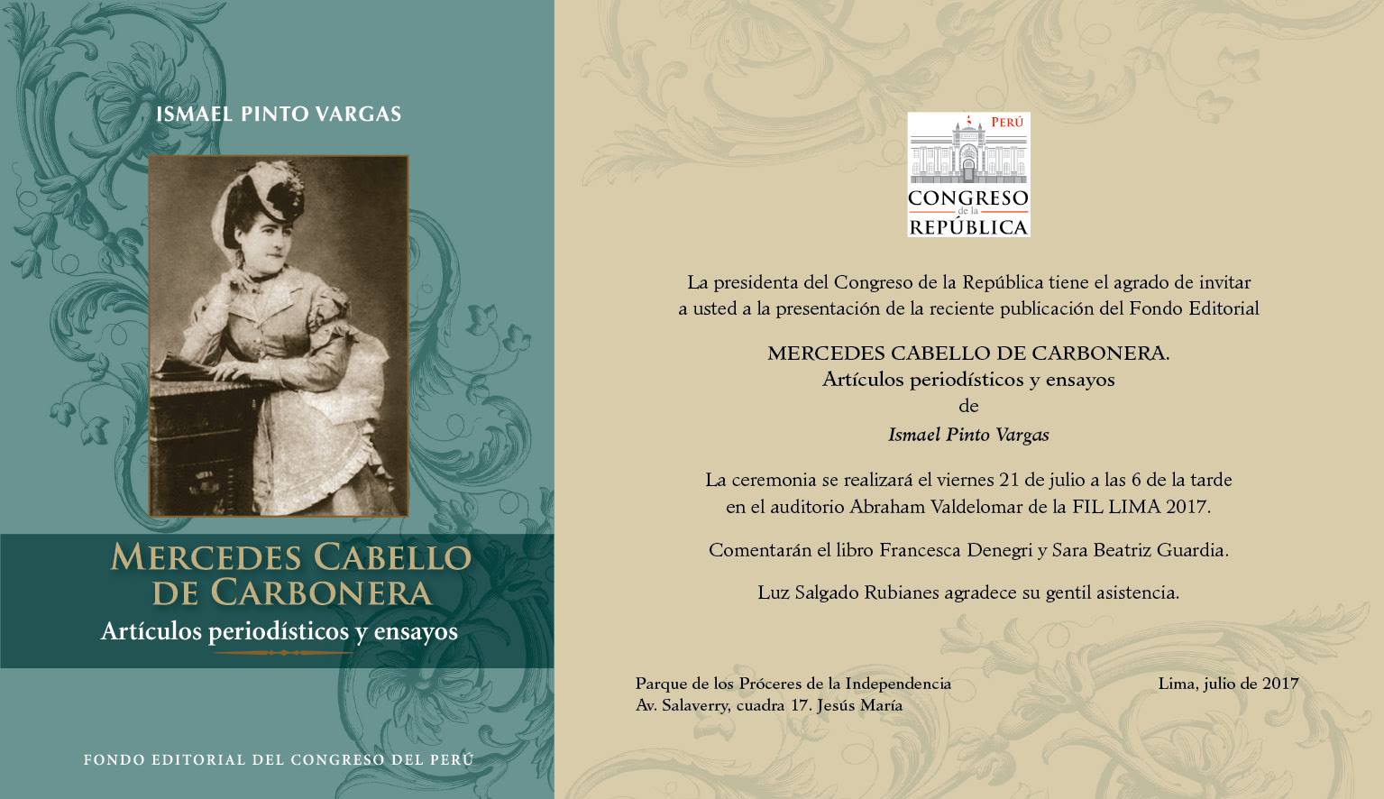 Presentación del libro Mercedes Cabello de Carbonera. Artículos periodísticos y Ensayos, de Ismael Pinto. Comentan: Francesca Denegri, y Sara Beatriz Guardia., Viernes 21, 6 pm. Auditorio Abraham Valdelomar.